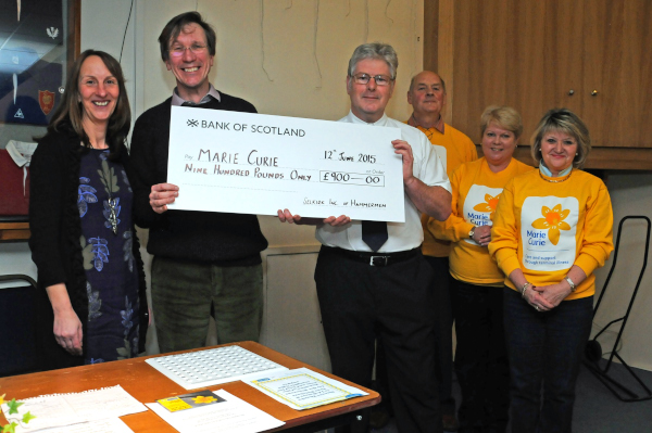 Selkirk Incorporation of Hammermen's presentation to the Selkirk Marie Curie Fundraising group at the recent charity Bingo Night. The money was raised by the Hammermen at last years Common Riding Foy.
