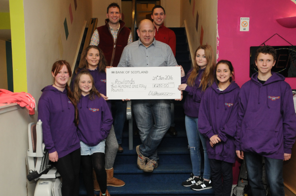 Selkirk Flapping Association Chairman Craig Stanners flanked by Ally Craig and Stuart Hogarth recently made a presentation to the youngsters at Rowlands (Dry Bar). Following another successful race meeting at the Gala Rig last August.